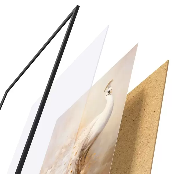 De poster bestaat uit een frame, plexiglas, geprinte afbeelding en spaanplaat achterkant. De poster kan meteen aan de muur worden gehangen dankzij de bevestigingen op de achterkant.