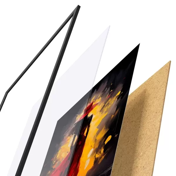 De poster bestaat uit een frame, plexiglas, geprinte afbeelding en spaanplaat achterkant. De poster kan meteen aan de muur worden gehangen dankzij de bevestigingen op de achterkant.