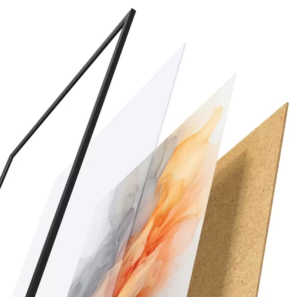 De poster bestaat uit een frame, plexiglas, geprinte afbeelding en spaanplaat achterkant. De poster kan meteen aan de muur worden gehangen dankzij de bevestigingen op de achterkant.