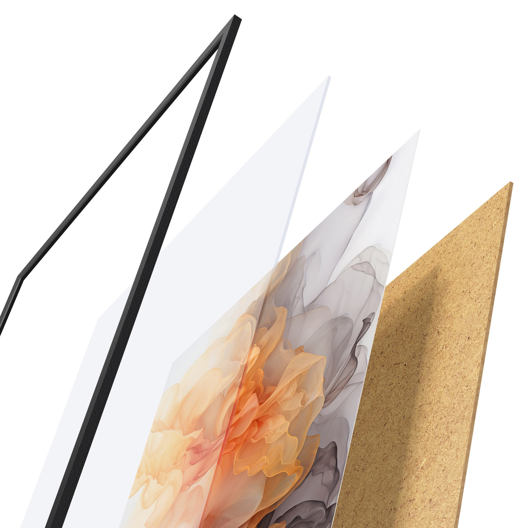 De poster bestaat uit een frame, plexiglas, geprinte afbeelding en spaanplaat achterkant. De poster kan meteen aan de muur worden gehangen dankzij de bevestigingen op de achterkant.