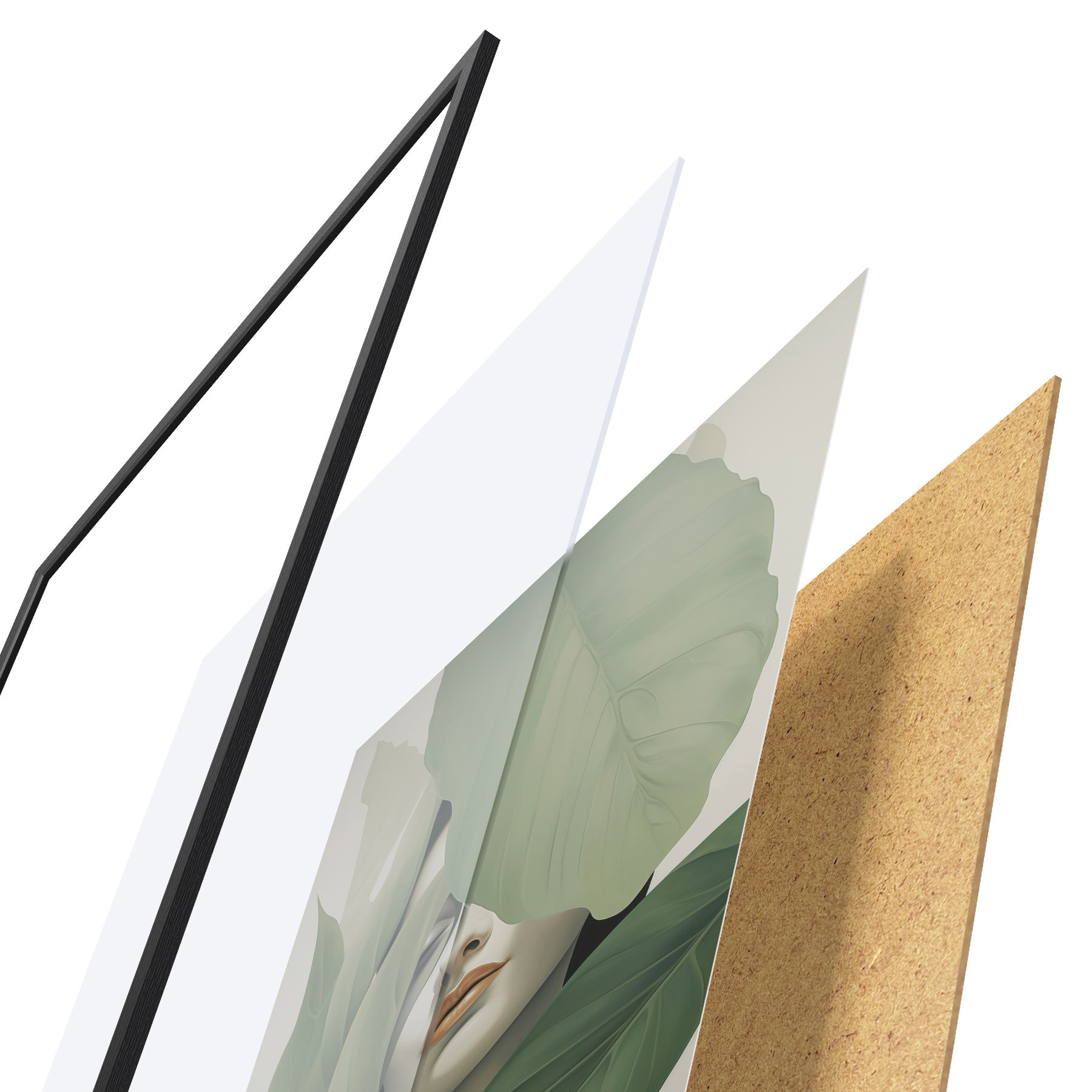 De poster bestaat uit een frame, plexiglas, geprinte afbeelding en spaanplaat achterkant. De poster kan meteen aan de muur worden gehangen dankzij de bevestigingen op de achterkant.