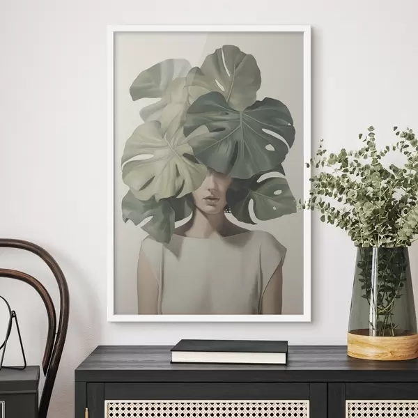 Poster Abstract portret van een meisje met monstera-bladeren Nr f47336