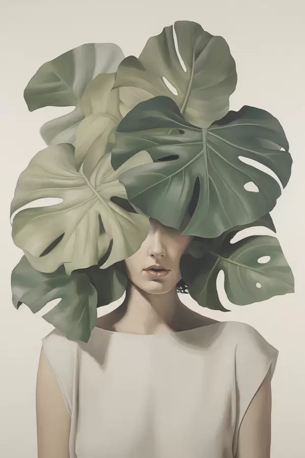 Poster Abstract portret van een meisje met monstera-bladeren Nr f47336