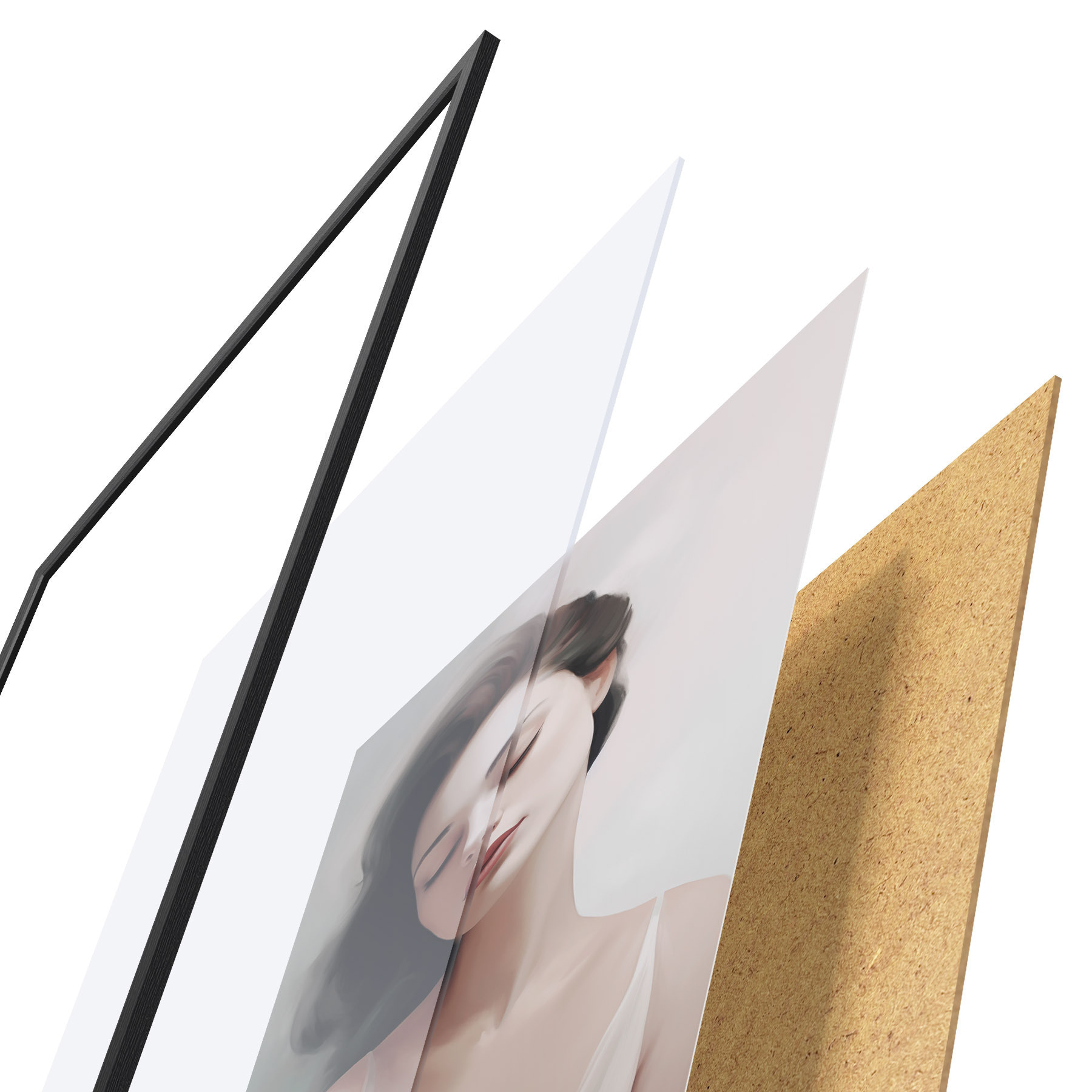 De poster bestaat uit een frame, plexiglas, geprinte afbeelding en spaanplaat achterkant. De poster kan meteen aan de muur worden gehangen dankzij de bevestigingen op de achterkant.