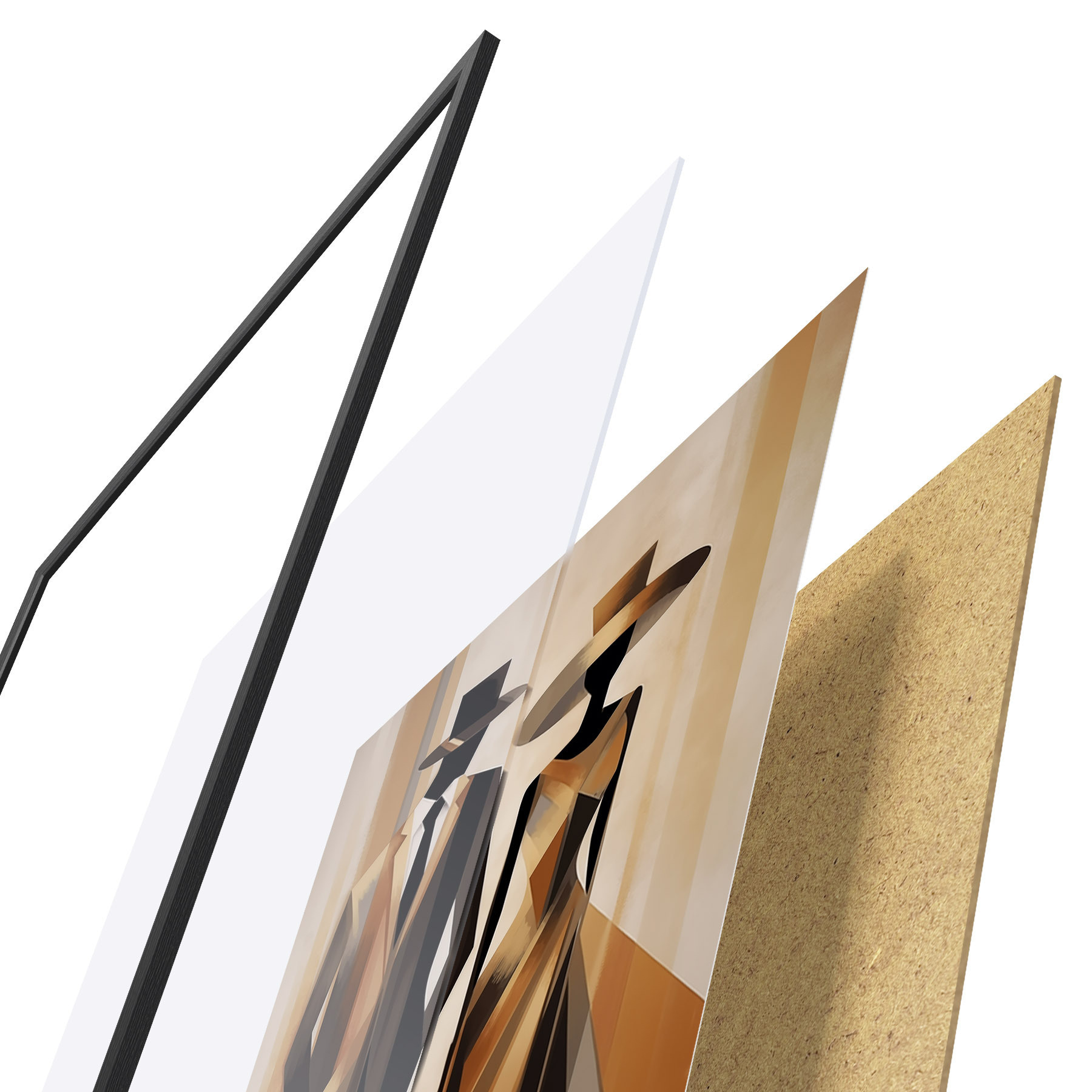 De poster bestaat uit een frame, plexiglas, geprinte afbeelding en spaanplaat achterkant. De poster kan meteen aan de muur worden gehangen dankzij de bevestigingen op de achterkant.