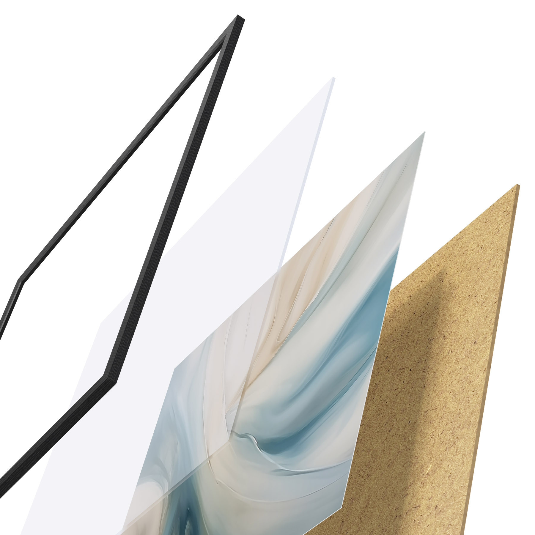 De poster bestaat uit een frame, plexiglas, geprinte afbeelding en spaanplaat achterkant. De poster kan meteen aan de muur worden gehangen dankzij de bevestigingen op de achterkant.