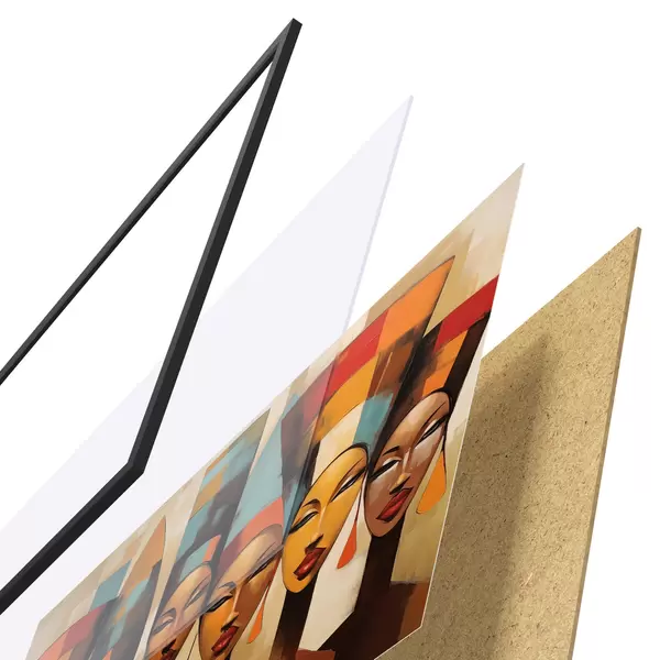 De poster bestaat uit een frame, plexiglas, geprinte afbeelding en spaanplaat achterkant. De poster kan meteen aan de muur worden gehangen dankzij de bevestigingen op de achterkant.