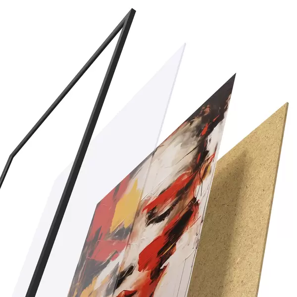 De poster bestaat uit een frame, plexiglas, geprinte afbeelding en spaanplaat achterkant. De poster kan meteen aan de muur worden gehangen dankzij de bevestigingen op de achterkant.