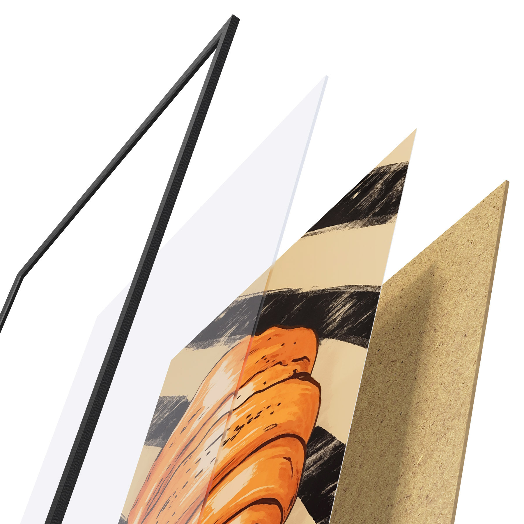 De poster bestaat uit een frame, plexiglas, geprinte afbeelding en spaanplaat achterkant. De poster kan meteen aan de muur worden gehangen dankzij de bevestigingen op de achterkant.