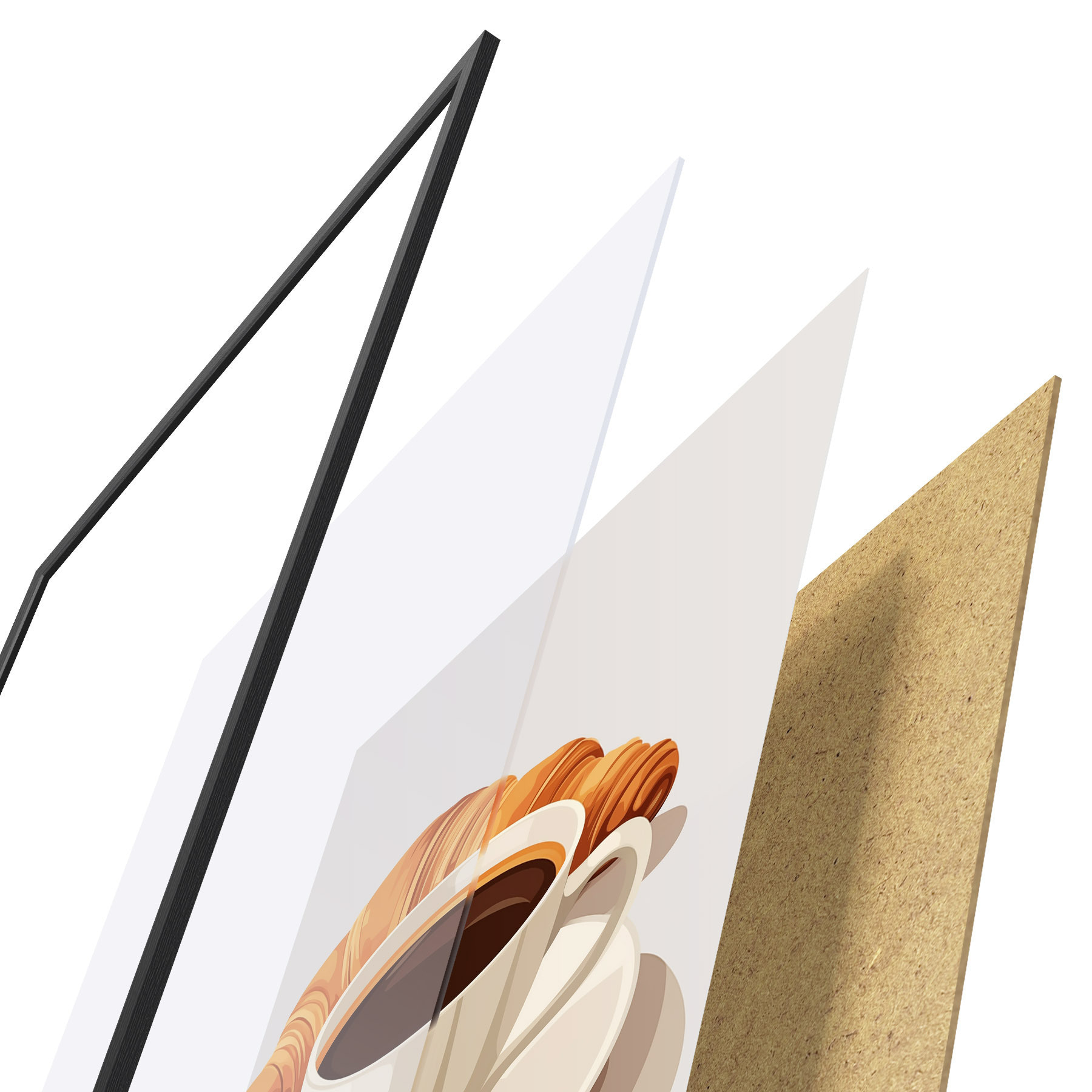 De poster bestaat uit een frame, plexiglas, geprinte afbeelding en spaanplaat achterkant. De poster kan meteen aan de muur worden gehangen dankzij de bevestigingen op de achterkant.