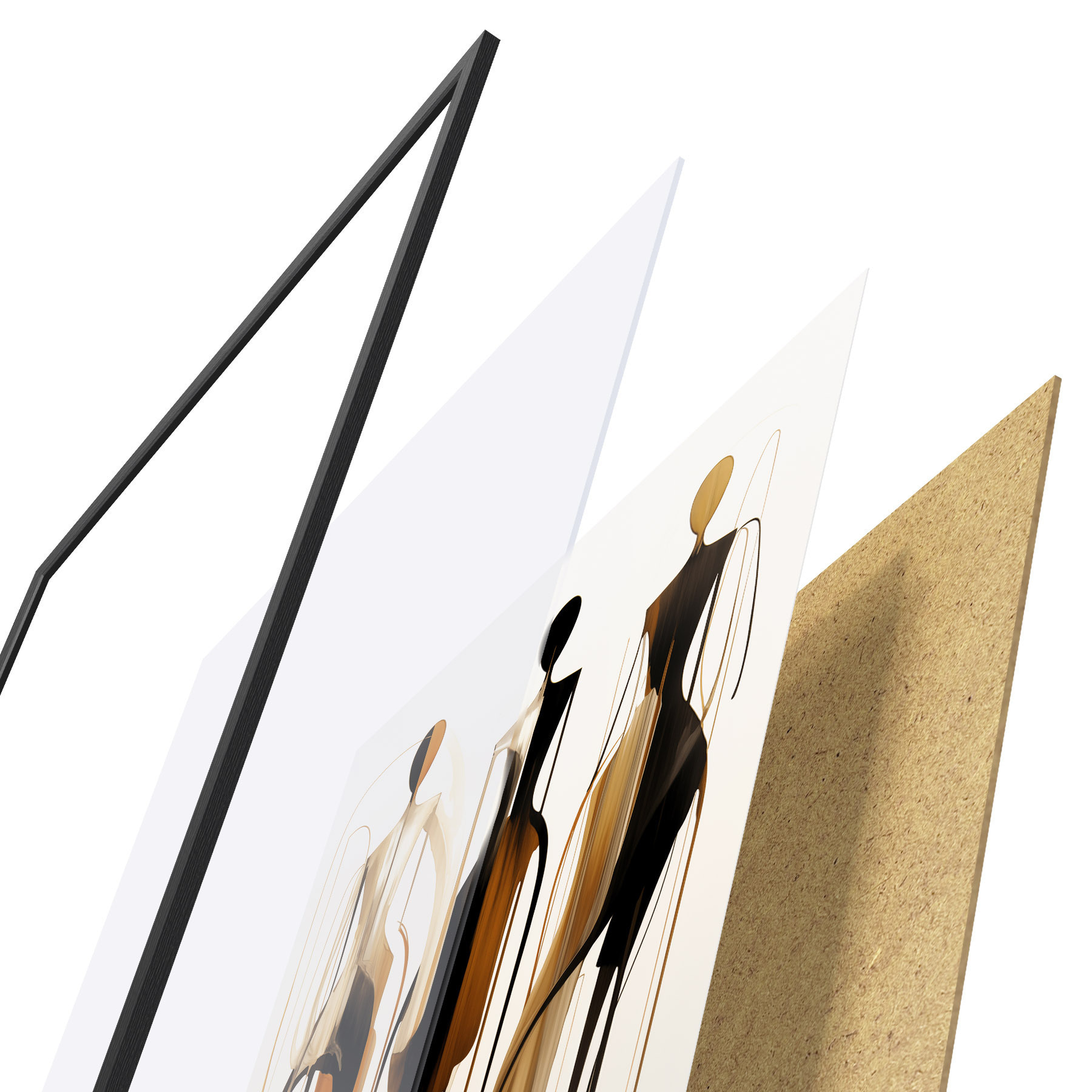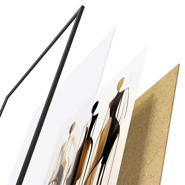 De poster bestaat uit een frame, plexiglas, geprinte afbeelding en spaanplaat achterkant. De poster kan meteen aan de muur worden gehangen dankzij de bevestigingen op de achterkant.