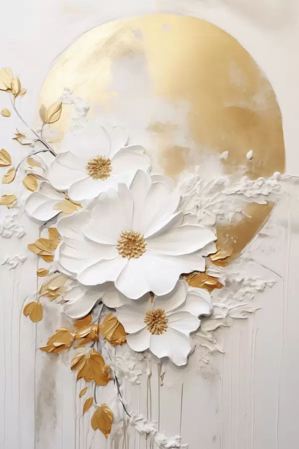 Poster Witte bloemen met gele accenten en delicate bladeren tegen een gestructureerde achtergrond, moderne kunst Nr f47414