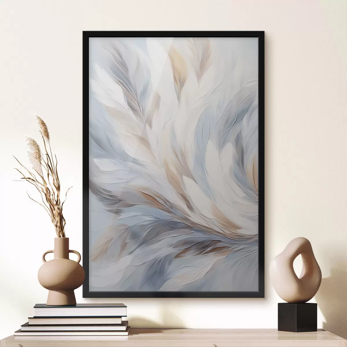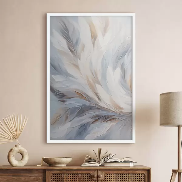 Poster Abstract schilderij van veren in tinten wit, blauw en bruin, met een zachte, vloeiende textuur en een lichte achtergrond. Nr f47417