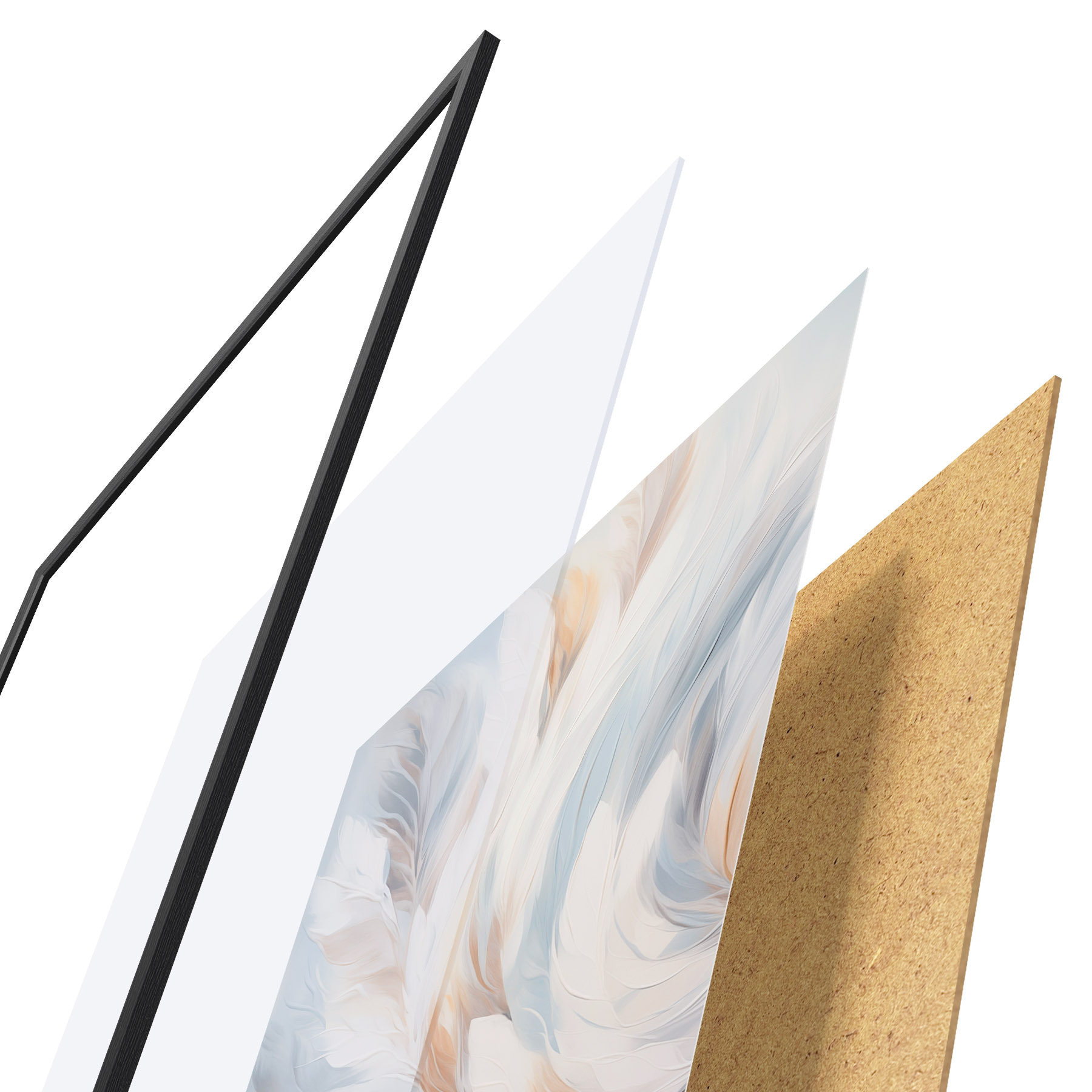 De poster bestaat uit een frame, plexiglas, geprinte afbeelding en spaanplaat achterkant. De poster kan meteen aan de muur worden gehangen dankzij de bevestigingen op de achterkant.
