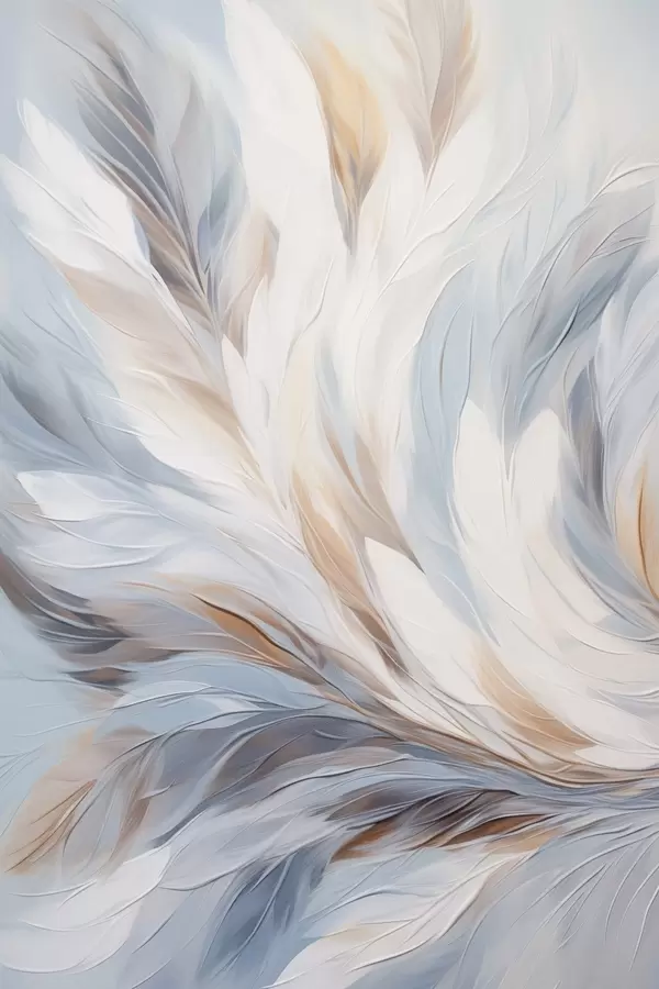 Poster Abstract schilderij van veren in tinten wit, blauw en bruin, met een zachte, vloeiende textuur en een lichte achtergrond. Nr f47417