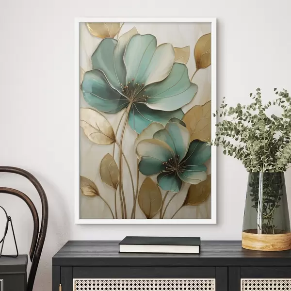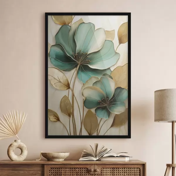Poster Grote blauwgroene en gele bloemen met contouren, omgeven door gele bladeren tegen een abstracte achtergrond Nr f47418