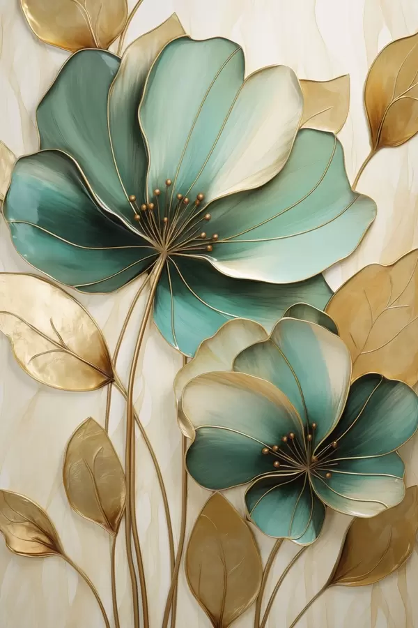 Poster Grote blauwgroene en gele bloemen met contouren, omgeven door gele bladeren tegen een abstracte achtergrond Nr f47418