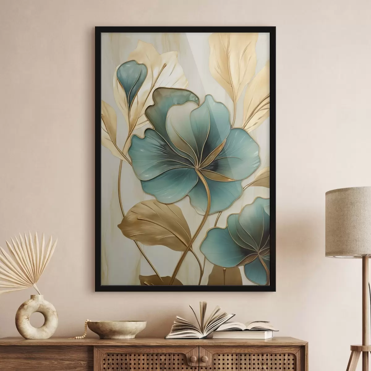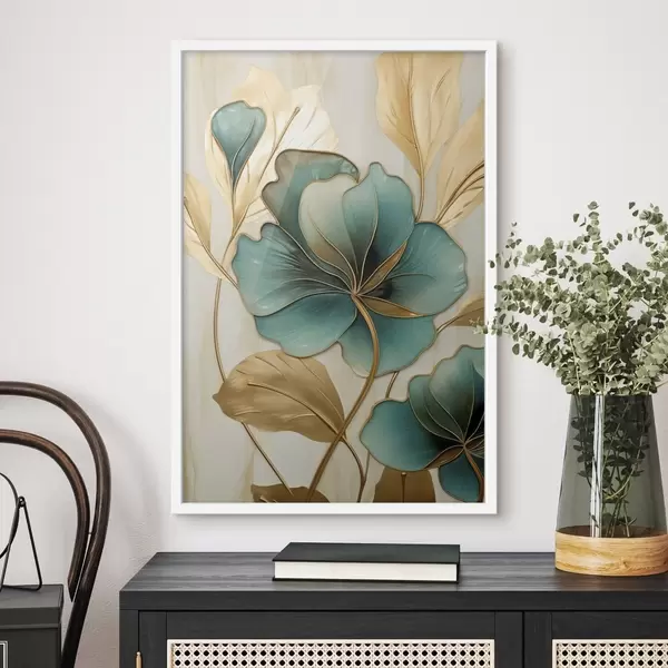 Poster Grote blauwgroene en gele bloemen met contouren, omgeven door gele bladeren tegen een abstracte achtergrond Nr f47419