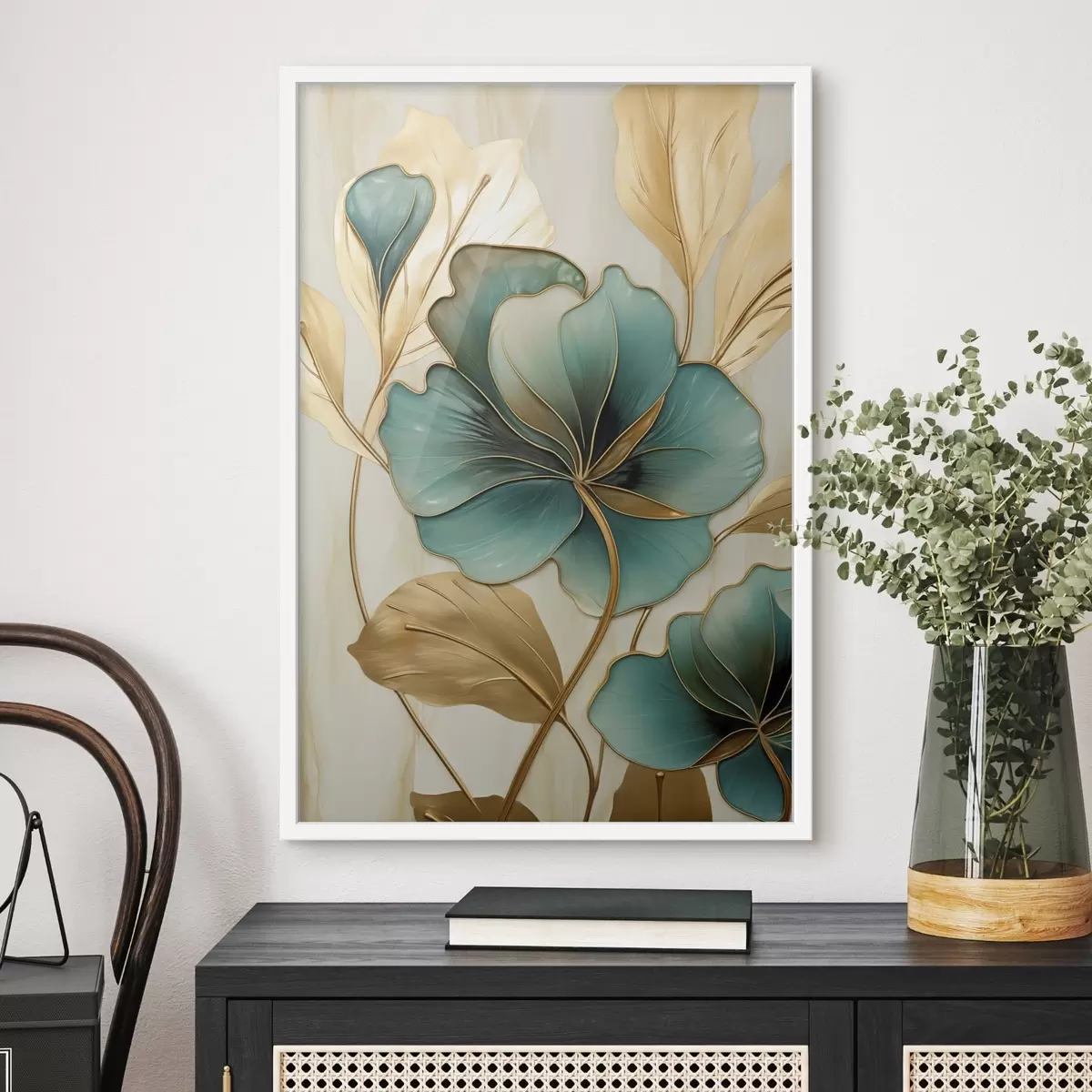 Poster Grote blauwgroene en gele bloemen met contouren, omgeven door gele bladeren tegen een abstracte achtergrond f47419