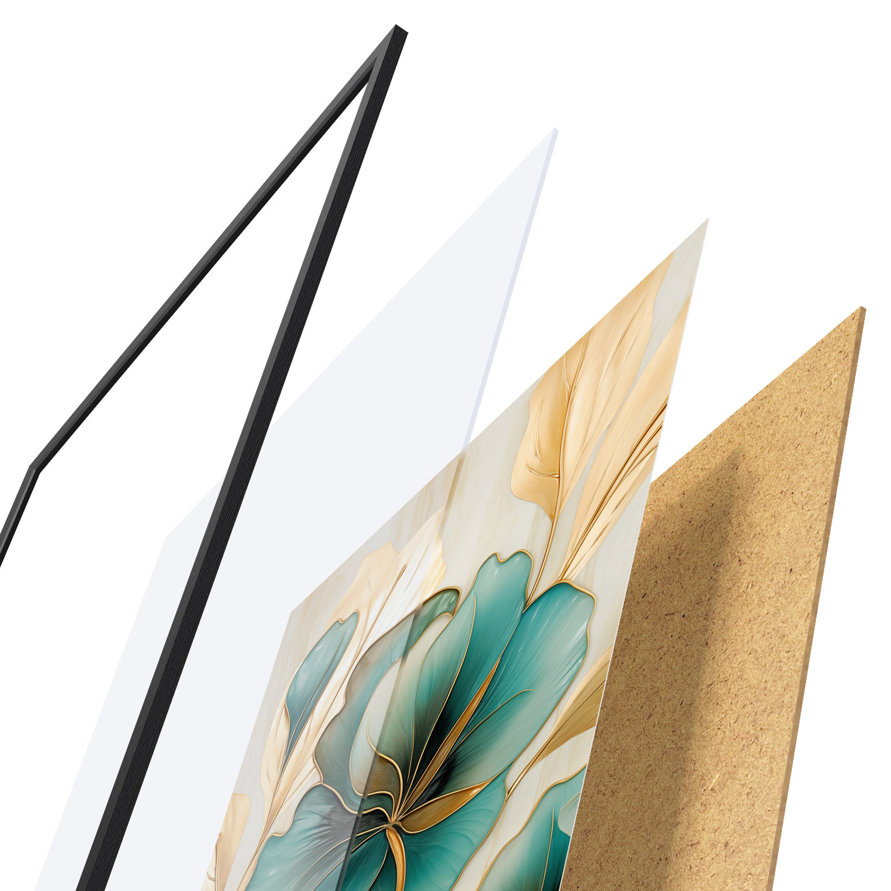 De poster bestaat uit een frame, plexiglas, geprinte afbeelding en spaanplaat achterkant. De poster kan meteen aan de muur worden gehangen dankzij de bevestigingen op de achterkant.