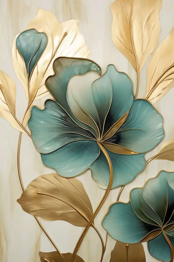 Poster Grote blauwgroene en gele bloemen met contouren, omgeven door gele bladeren tegen een abstracte achtergrond Nr f47419