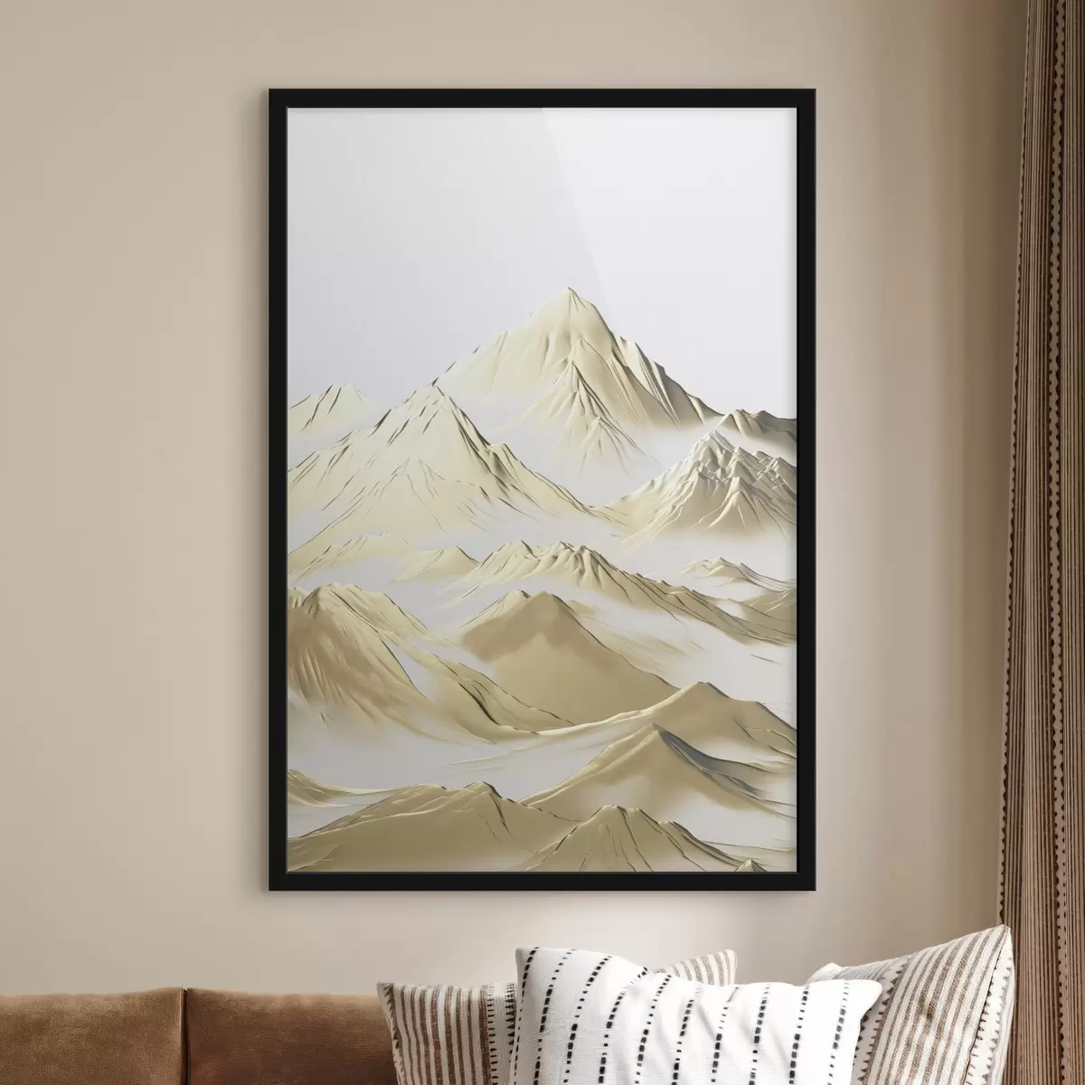Poster Een landschap van gele, met sneeuw bedekte bergen met scherpe toppen en diepe valleien onder een heldere hemel. f47421