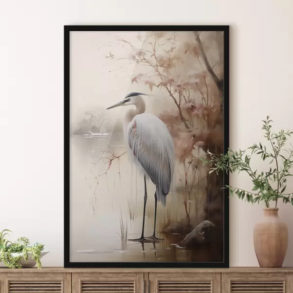 Poster Een reiger staat op een rots in een meer met hoog gras en bomen op de achtergrond. Nr f47427