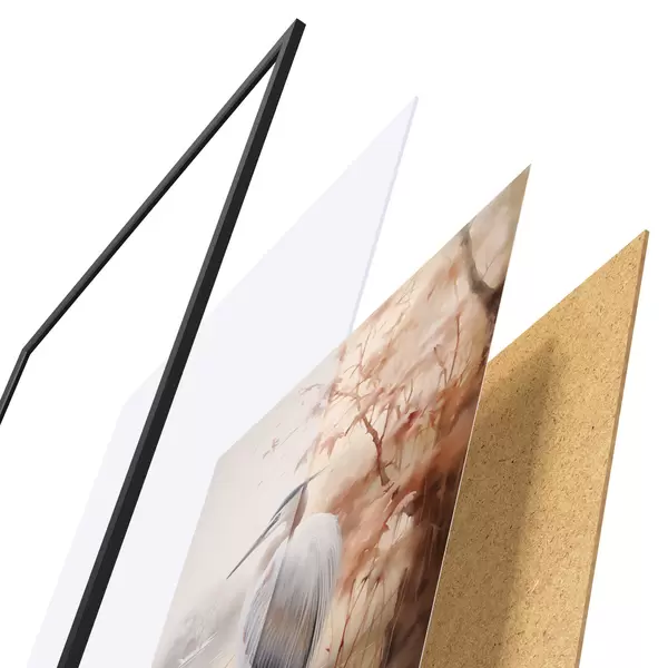 De poster bestaat uit een frame, plexiglas, geprinte afbeelding en spaanplaat achterkant. De poster kan meteen aan de muur worden gehangen dankzij de bevestigingen op de achterkant.