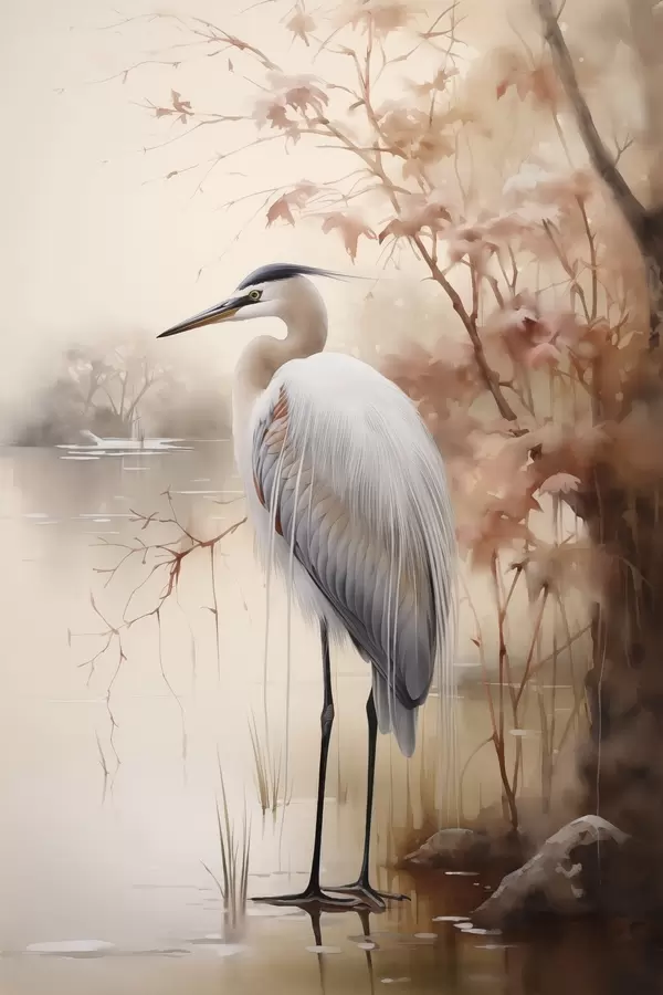 Poster Een reiger staat op een rots in een meer met hoog gras en bomen op de achtergrond. Nr f47427