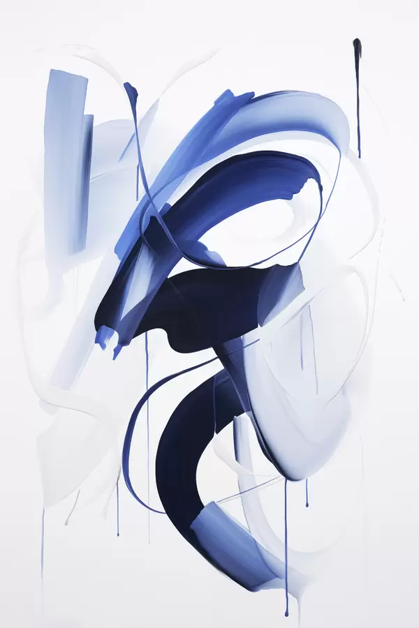 Poster Abstracte blauwe penseelstreekachtige vormen met vloeiende lijnen en rondingen tegen een witte achtergrond, moderne kunst f47428