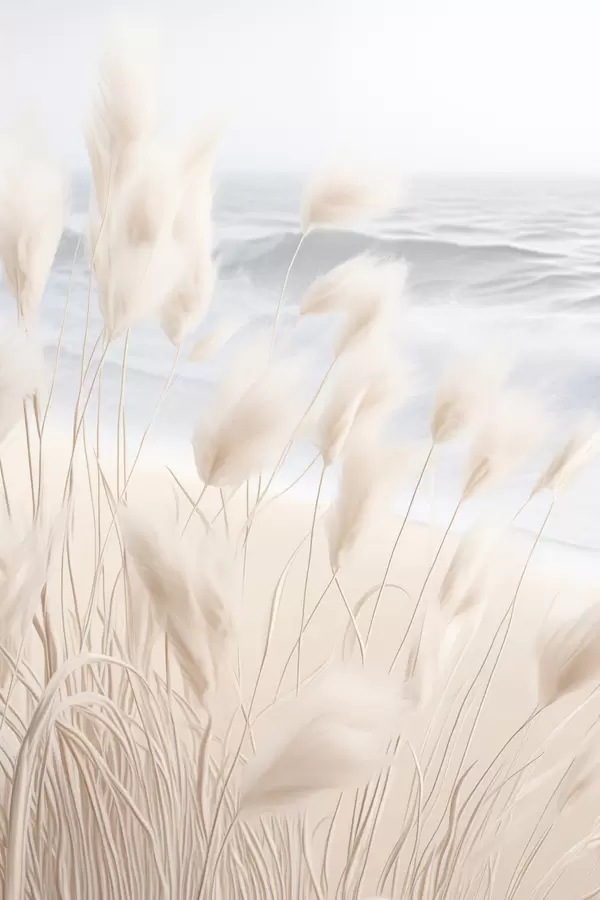 Poster Hoog, vederachtig pampagras in zachte beige tinten op de voorgrond, met een zandstrand op de achtergrond Nr f47432