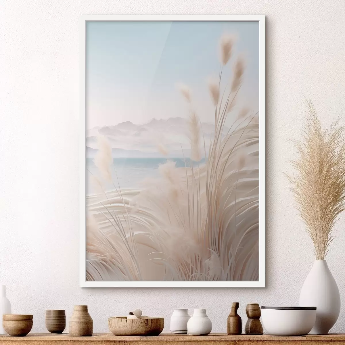 Poster Hoog, vederachtig pampagras in zachte beige tinten, met een zandstrand en bergen op de achtergrond Nr f47433