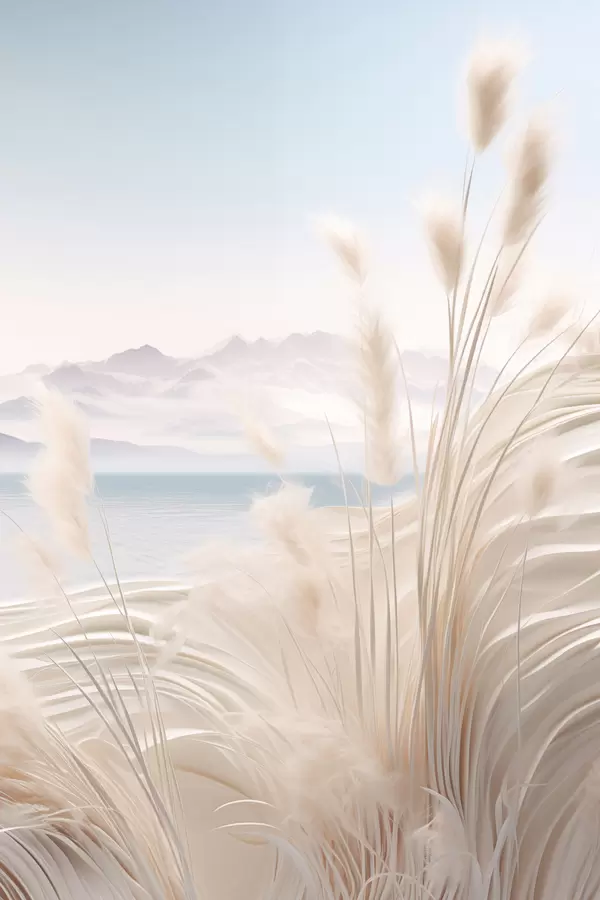 Poster Hoog, vederachtig pampagras in zachte beige tinten, met een zandstrand en bergen op de achtergrond Nr f47433