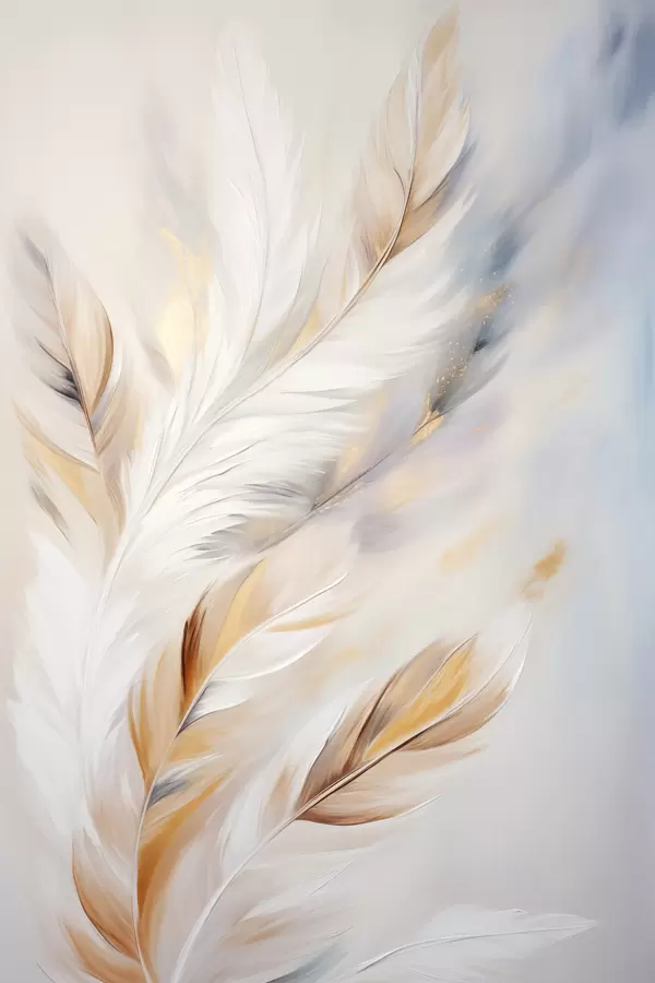 Poster Grote, zachte veren met een mix van witte, gele en bruine tinten, tegen een lichte, abstracte achtergrond. Nr f47443