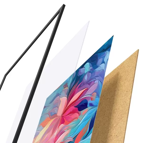 De poster bestaat uit een frame, plexiglas, geprinte afbeelding en spaanplaat achterkant. De poster kan meteen aan de muur worden gehangen dankzij de bevestigingen op de achterkant.
