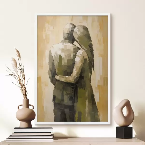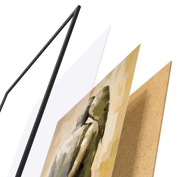 De poster bestaat uit een frame, plexiglas, geprinte afbeelding en spaanplaat achterkant. De poster kan meteen aan de muur worden gehangen dankzij de bevestigingen op de achterkant.