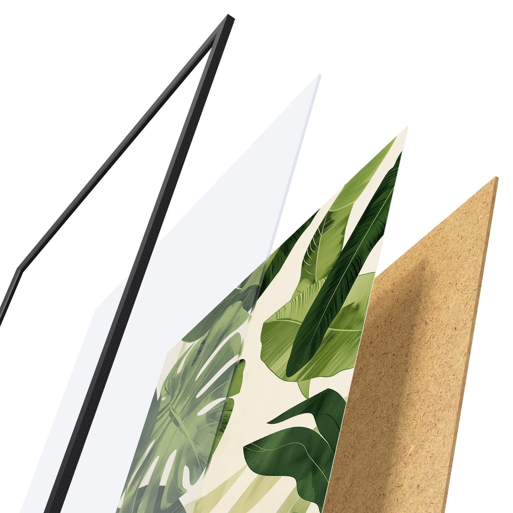De poster bestaat uit een frame, plexiglas, geprinte afbeelding en spaanplaat achterkant. De poster kan meteen aan de muur worden gehangen dankzij de bevestigingen op de achterkant.