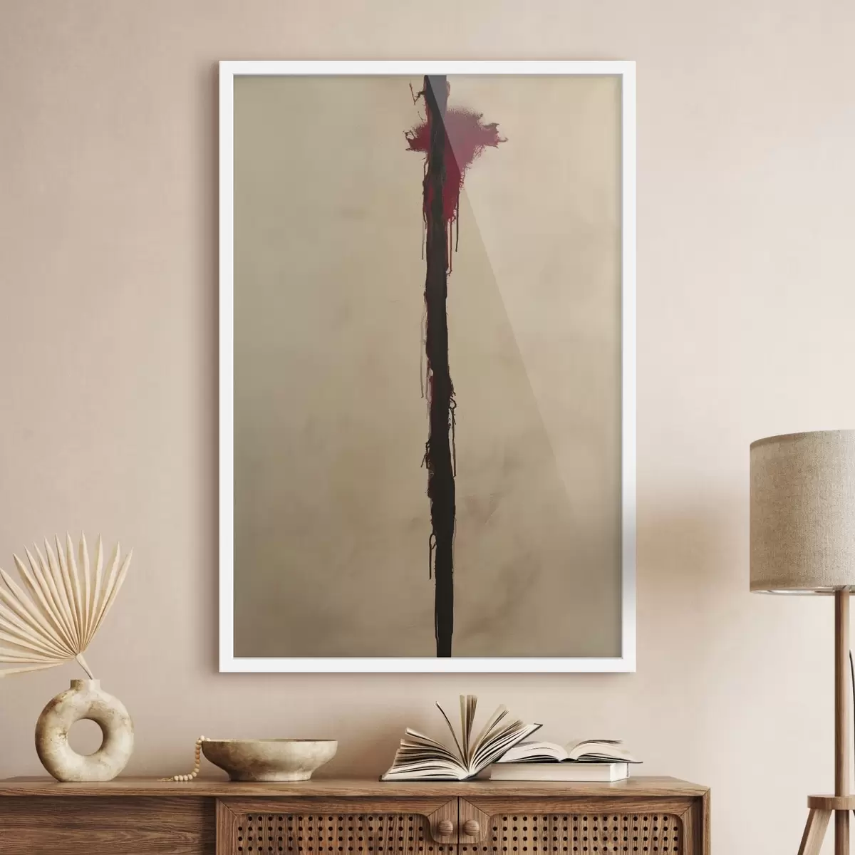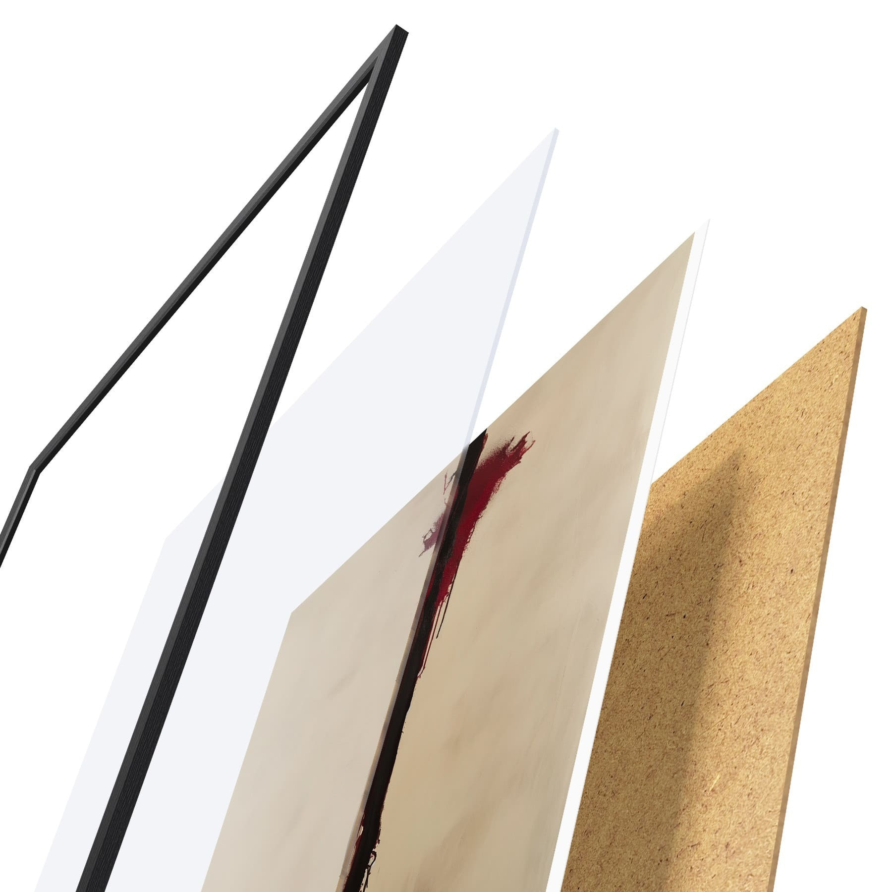 De poster bestaat uit een frame, plexiglas, geprinte afbeelding en spaanplaat achterkant. De poster kan meteen aan de muur worden gehangen dankzij de bevestigingen op de achterkant.