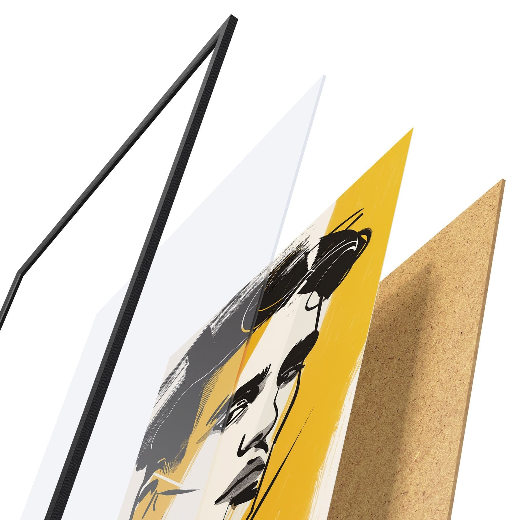 De poster bestaat uit een frame, plexiglas, geprinte afbeelding en spaanplaat achterkant. De poster kan meteen aan de muur worden gehangen dankzij de bevestigingen op de achterkant.
