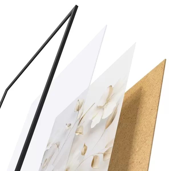 De poster bestaat uit een frame, plexiglas, geprinte afbeelding en spaanplaat achterkant. De poster kan meteen aan de muur worden gehangen dankzij de bevestigingen op de achterkant.