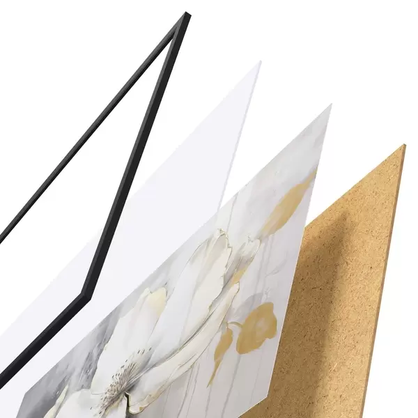 De poster bestaat uit een frame, plexiglas, geprinte afbeelding en spaanplaat achterkant. De poster kan meteen aan de muur worden gehangen dankzij de bevestigingen op de achterkant.