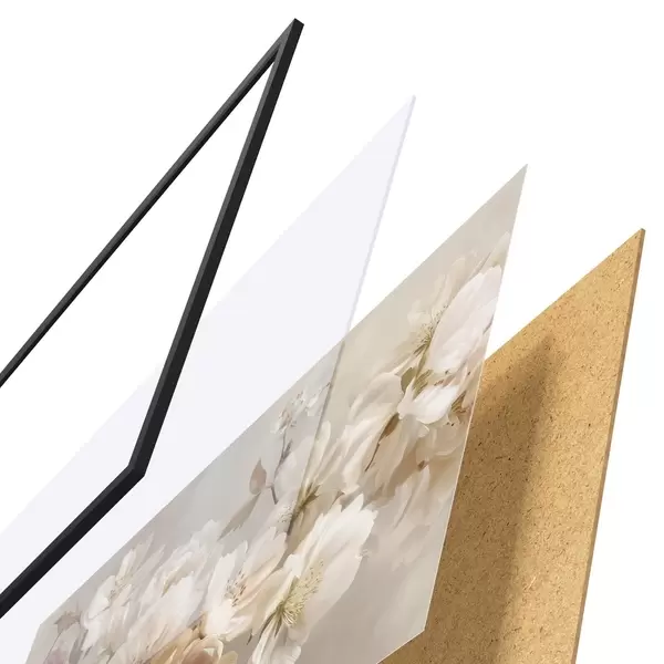 De poster bestaat uit een frame, plexiglas, geprinte afbeelding en spaanplaat achterkant. De poster kan meteen aan de muur worden gehangen dankzij de bevestigingen op de achterkant.
