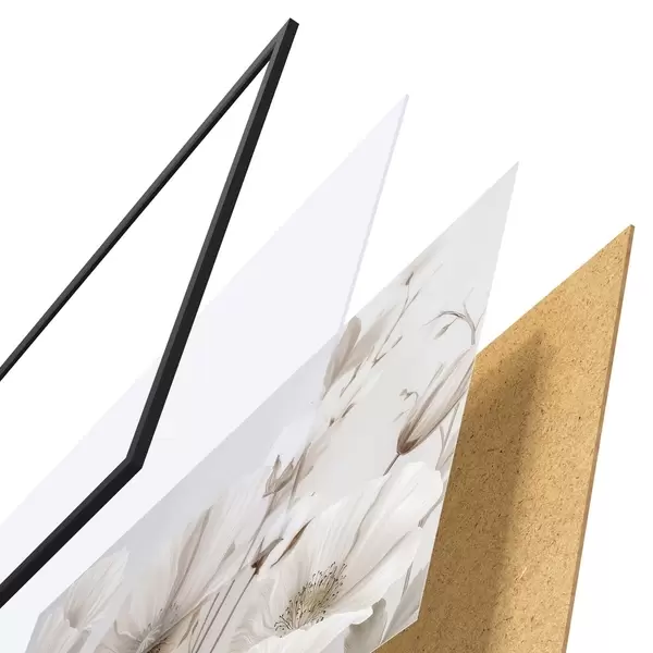 De poster bestaat uit een frame, plexiglas, geprinte afbeelding en spaanplaat achterkant. De poster kan meteen aan de muur worden gehangen dankzij de bevestigingen op de achterkant.