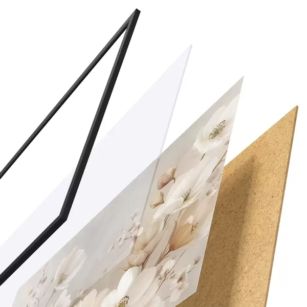 De poster bestaat uit een frame, plexiglas, geprinte afbeelding en spaanplaat achterkant. De poster kan meteen aan de muur worden gehangen dankzij de bevestigingen op de achterkant.