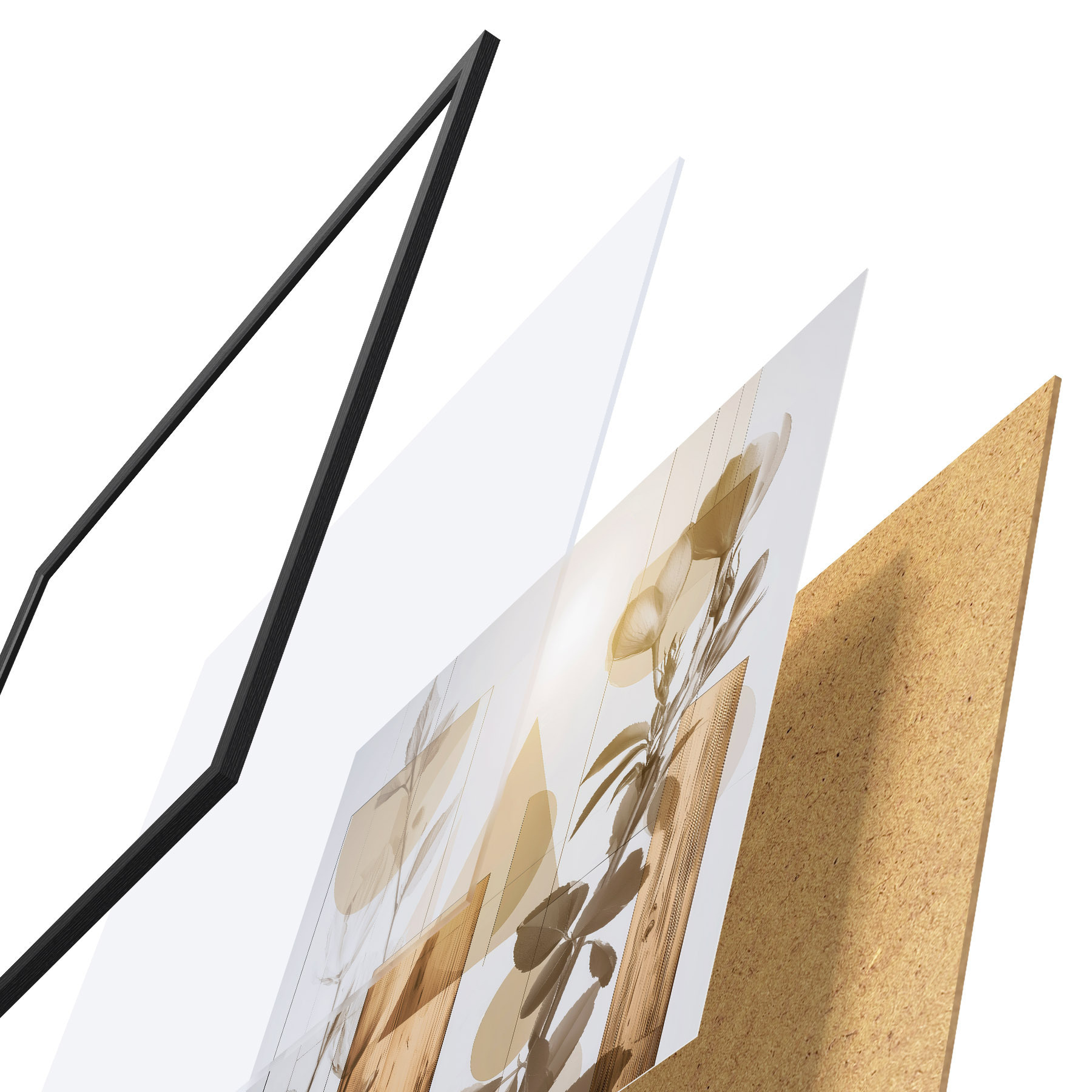 De poster bestaat uit een frame, plexiglas, geprinte afbeelding en spaanplaat achterkant. De poster kan meteen aan de muur worden gehangen dankzij de bevestigingen op de achterkant.