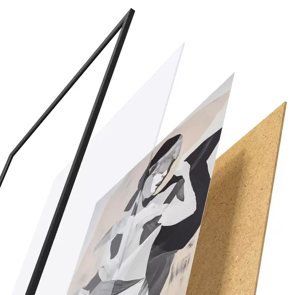 De poster bestaat uit een frame, plexiglas, geprinte afbeelding en spaanplaat achterkant. De poster kan meteen aan de muur worden gehangen dankzij de bevestigingen op de achterkant.