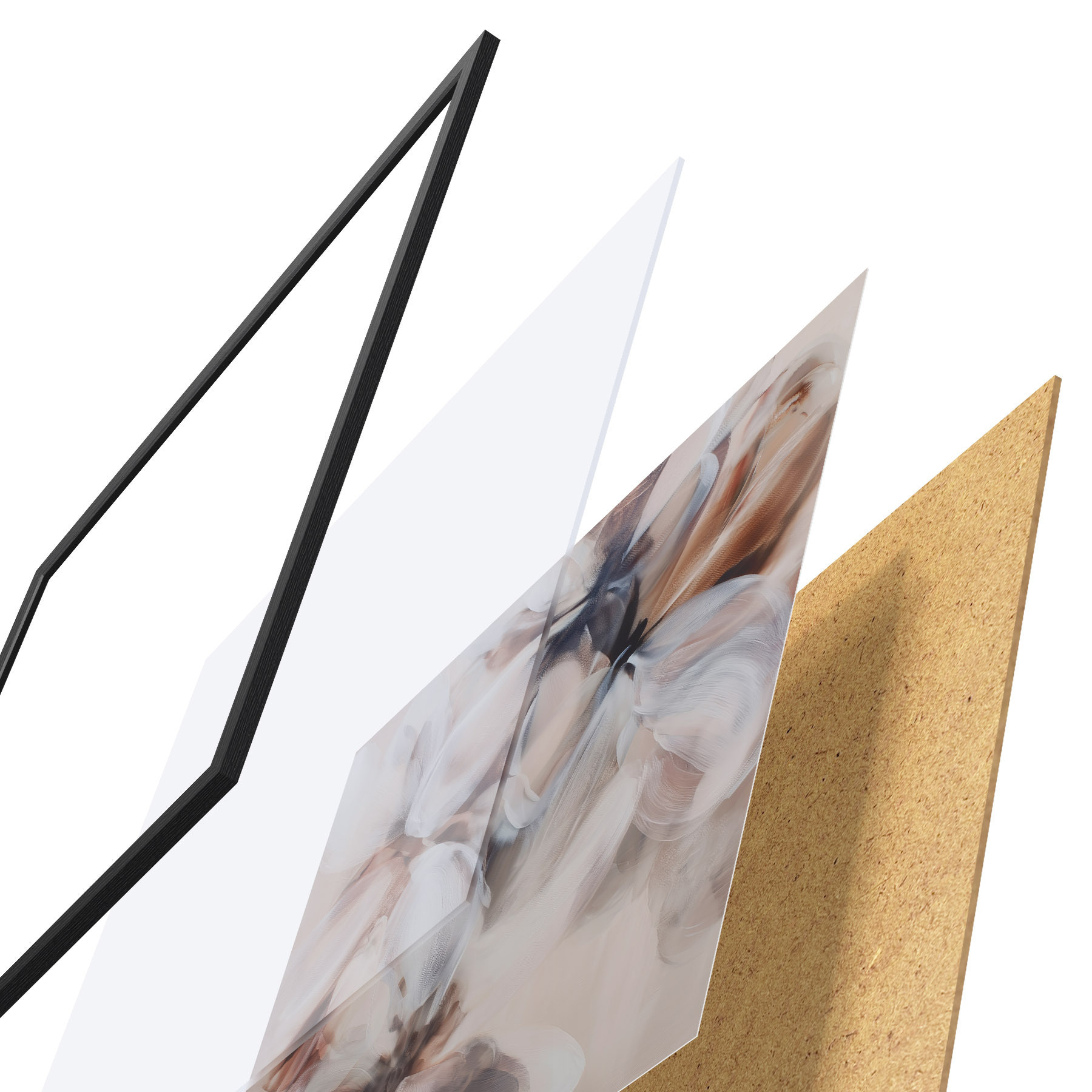 De poster bestaat uit een frame, plexiglas, geprinte afbeelding en spaanplaat achterkant. De poster kan meteen aan de muur worden gehangen dankzij de bevestigingen op de achterkant.