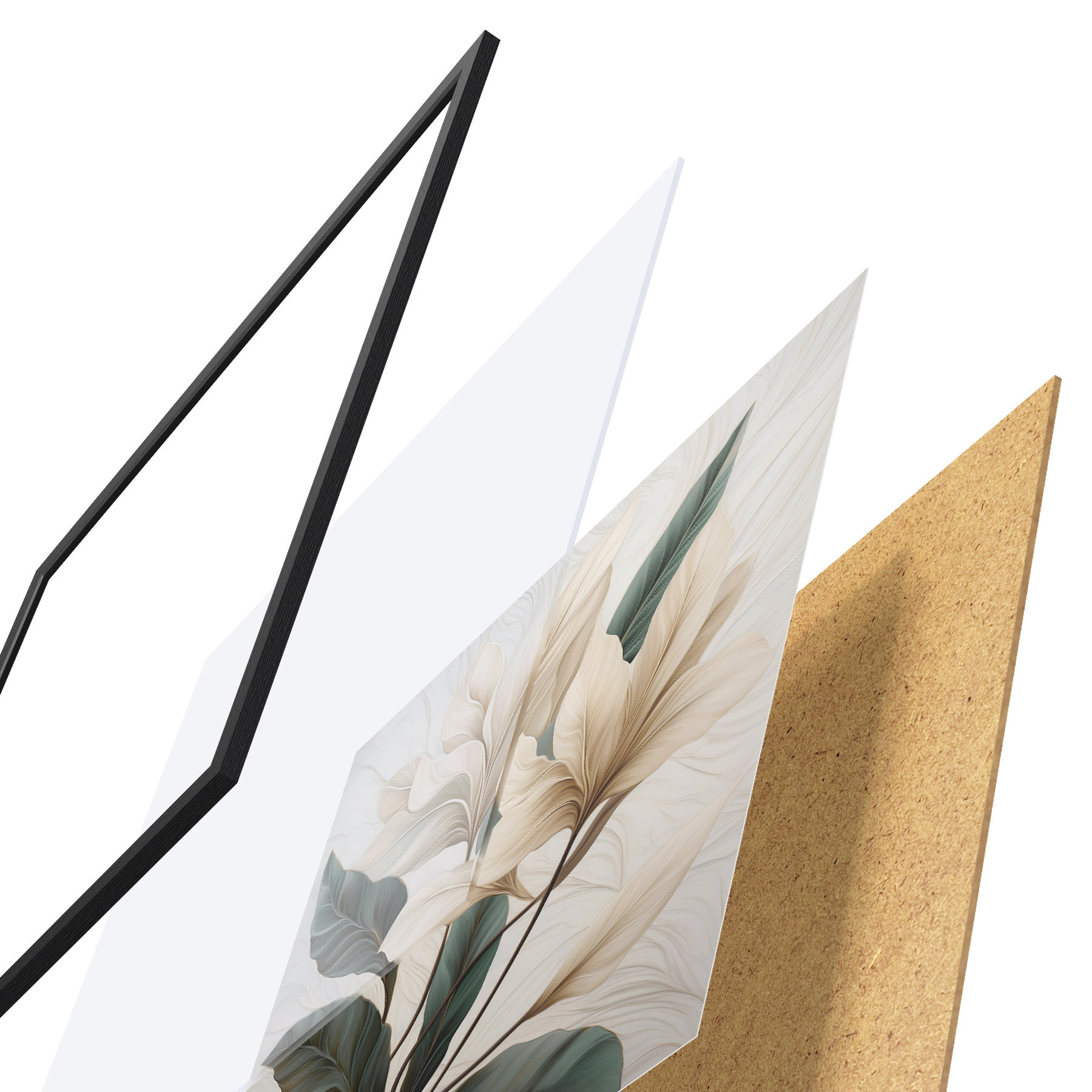 De poster bestaat uit een frame, plexiglas, geprinte afbeelding en spaanplaat achterkant. De poster kan meteen aan de muur worden gehangen dankzij de bevestigingen op de achterkant.