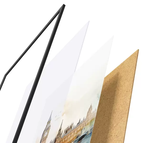 De poster bestaat uit een frame, plexiglas, geprinte afbeelding en spaanplaat achterkant. De poster kan meteen aan de muur worden gehangen dankzij de bevestigingen op de achterkant.