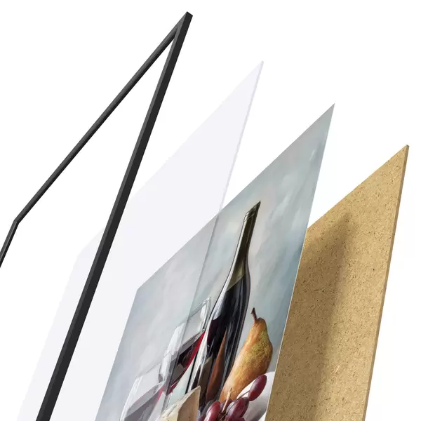 De poster bestaat uit een frame, plexiglas, geprinte afbeelding en spaanplaat achterkant. De poster kan meteen aan de muur worden gehangen dankzij de bevestigingen op de achterkant.